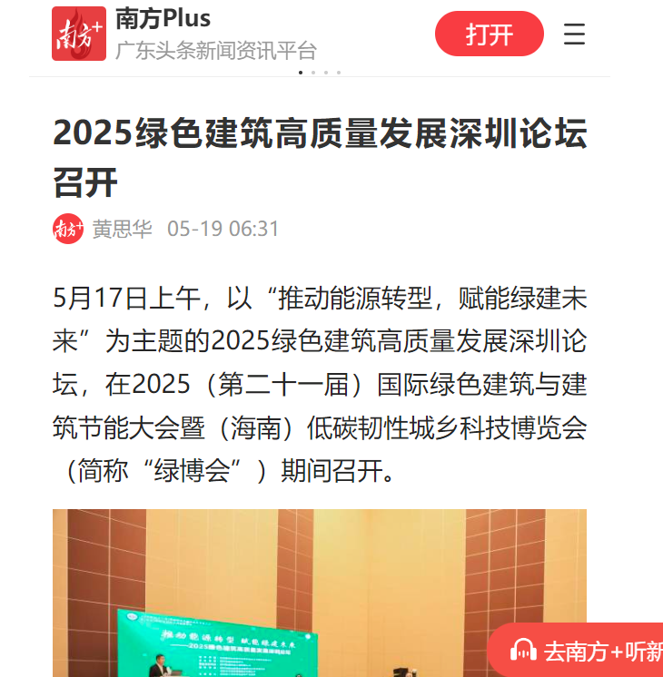 5月16至17日,2025(第二十一届)国际绿色建筑与建筑节能大会暨(海南)低碳韧性城乡科技博览会(简称“绿博会”)在海南国际会展中心隆重召开。大会期间,为助推深圳以及粤港澳大湾区绿色建筑高质量发展,云博国际网站联合粤港澳地区同行业组织和有关单位举办“推动能源转型,赋能绿建未来——2025绿色建筑高质量发展深圳论坛”“发展新质生产力,推动产业再升级——粤港澳大湾区绿色建筑产业发展高峰论坛”两个专题论坛,备受媒体关注,吸引南方日报、南方都市报、深圳商报、深圳特区报、新浪网、凤凰网等多家媒体竞相报道。